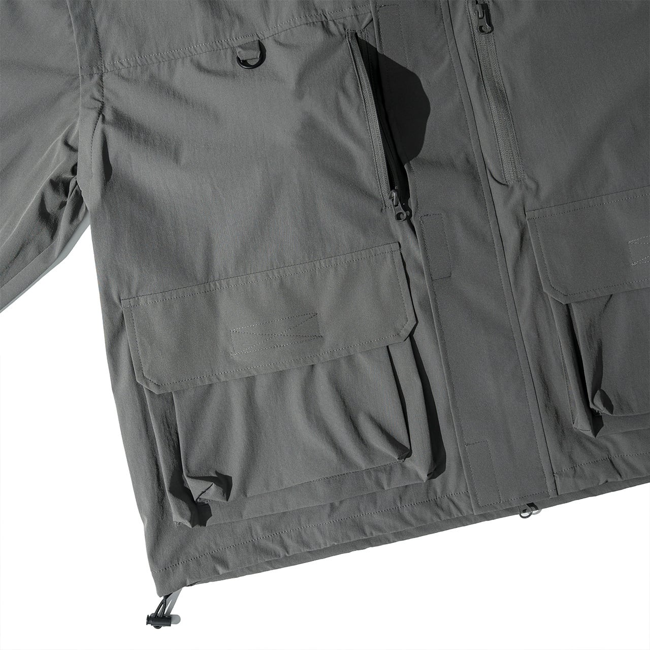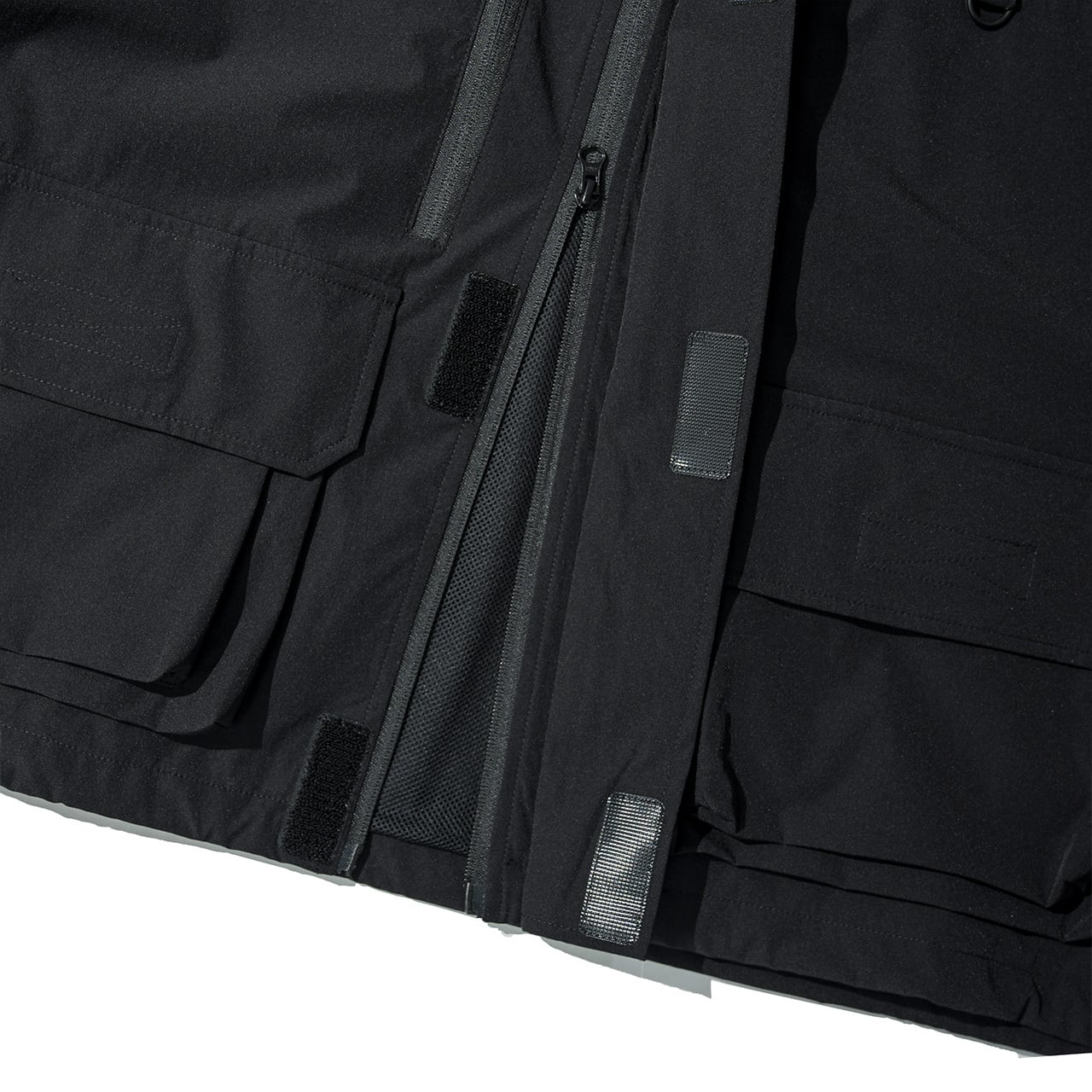 ■フロントフラップ設計、袖口ベルクロ、裾はドローコードで調整可能。